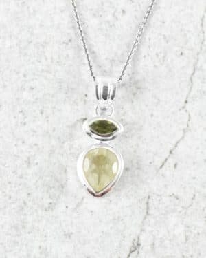 Amazing Faceted Emerald Cut Moldavite Lemon Quartz Necklace Wrapped in Sterling Silver